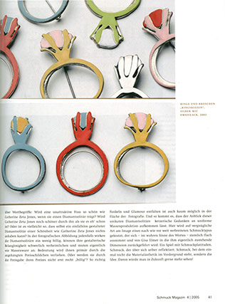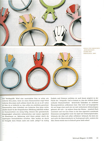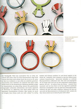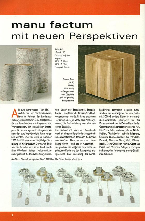 2005 wurden meine Ohrhänger „Diamonds are a girls best friend“ mit dem Staatspreis für das Kunsthandwerk des Landes Nordrhein-Westfalen ausgezeichnet. Seit 2002 habe ich mich an diversen Ausstellungen im In- und Ausland beteiligt.