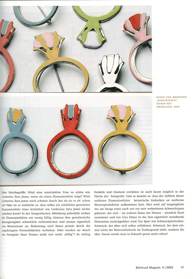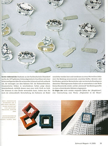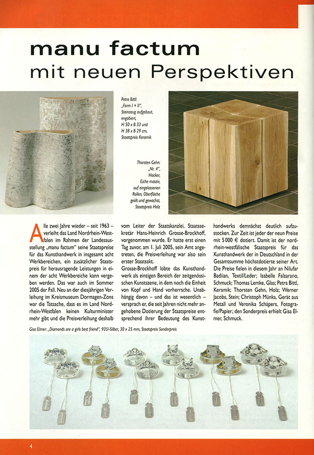 2005 wurden meine Ohrhänger „Diamonds are a girls best friend“ mit dem Staatspreis für das Kunsthandwerk des Landes Nordrhein-Westfalen ausgezeichnet. Seit 2002 habe ich mich an diversen Ausstellungen im In- und Ausland beteiligt.